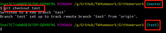 git branch test切换当前分支到 test(当你切换分支的时候,Git 会重置你的工作目录,使其看起来像回到了你在那个分支上最后一次提交的样子。 Git 会自动添加、删除、修改文件以确保此时你的工作目录和这个分支最后一次提交时的样子一模一样)